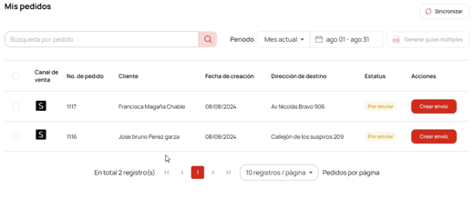 2. Desde aquí, podrás generar guías de envío para tus pedidos de SHEIN haciendo clic en el botón Crear envío.