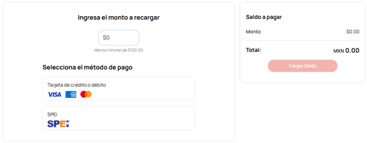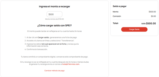 7. Si decides realizar tu recargar de saldo a través de SPEI, ingresa el monto que deseas agregar y haz clic en el botón Cargar Saldo