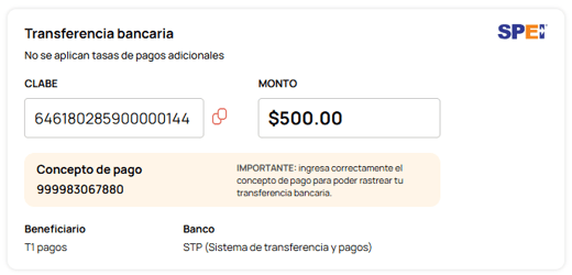 8. Se generará una ficha digital dinámica que contendrá información única para cada recarga, incluyendo un Concepto de pago y una CLABE diferentes en cada ocasión.